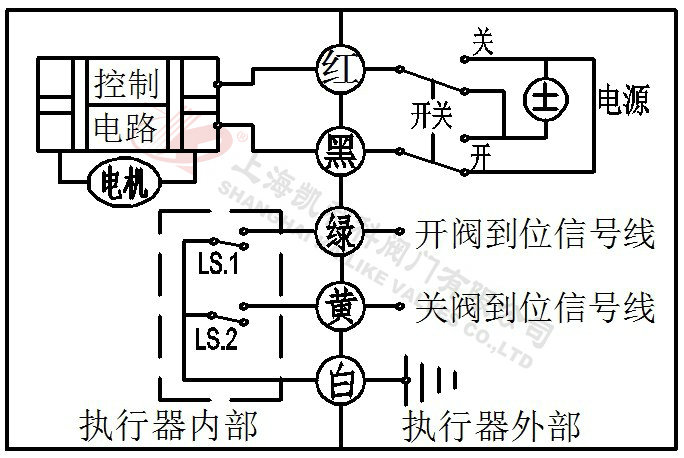 2、開關(guān)與紅線接通,閥門打開,閥門全開到位后執(zhí)行器內(nèi)部自動(dòng)斷電。