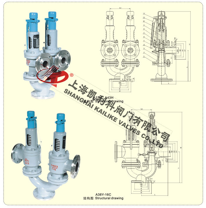 A38Y、A43H、A37H雙聯(lián)彈簧式安全閥適用于工作溫度≤350℃的蒸汽、水等介質(zhì)的設備和管路上。作為超壓保護裝置。A38Y、A43H、A37H型雙聯(lián)彈簧式安全閥是在Y型接頭上裝設兩個同樣規(guī)格的A48Y或A47H型安全閥而構(gòu)成,其公稱通徑系列指Y型接頭進口通徑。